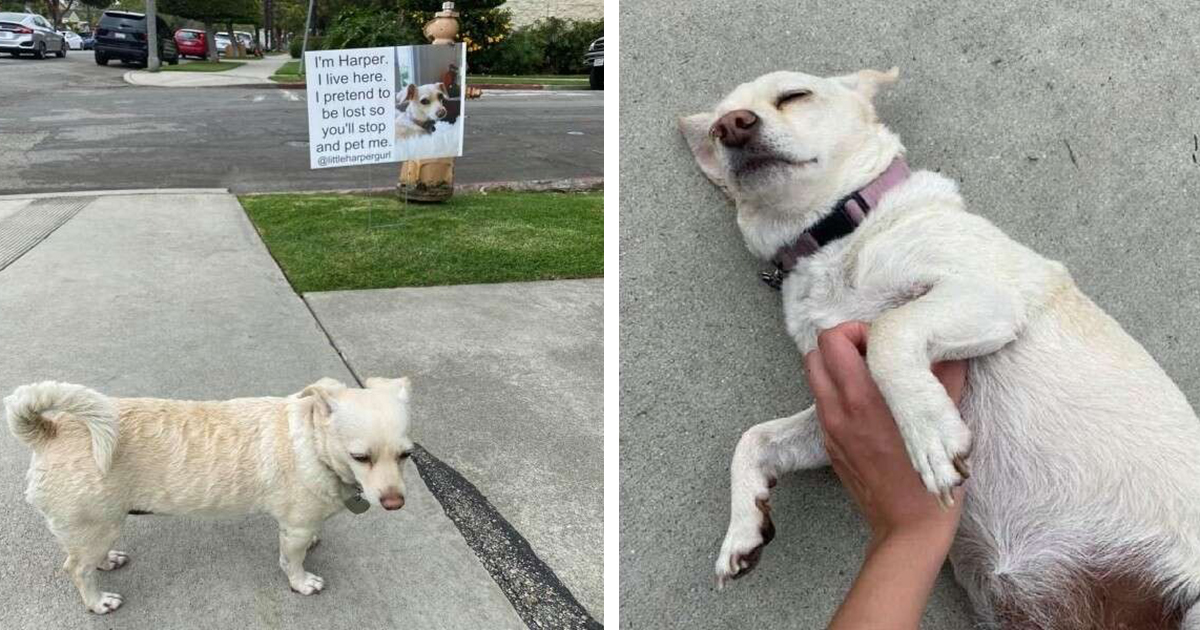 She approached and a sign not far from the dog caught her eye – “My name is Harper. I live here and I like to pretend to be lost. Just stop and stroke me.”