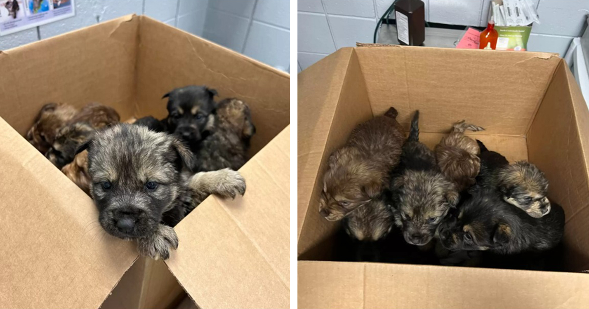 On an icy rainy day, a stranger came across a package and was surprised when he was inside. Small puppies were hiding from the rain and the cold, laying close to each other to keep each other warm. He called an officer which came to the rescue almost immediately.