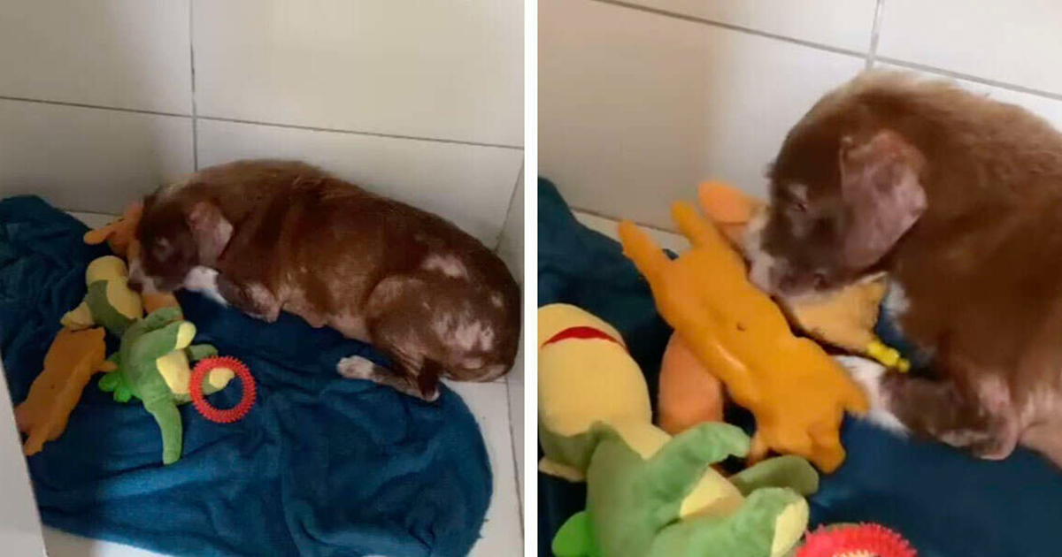 They placed some toys on the ground and noticed that she started to pick them up one by one and take them all to her bed. She took care of them like they were her real babies.