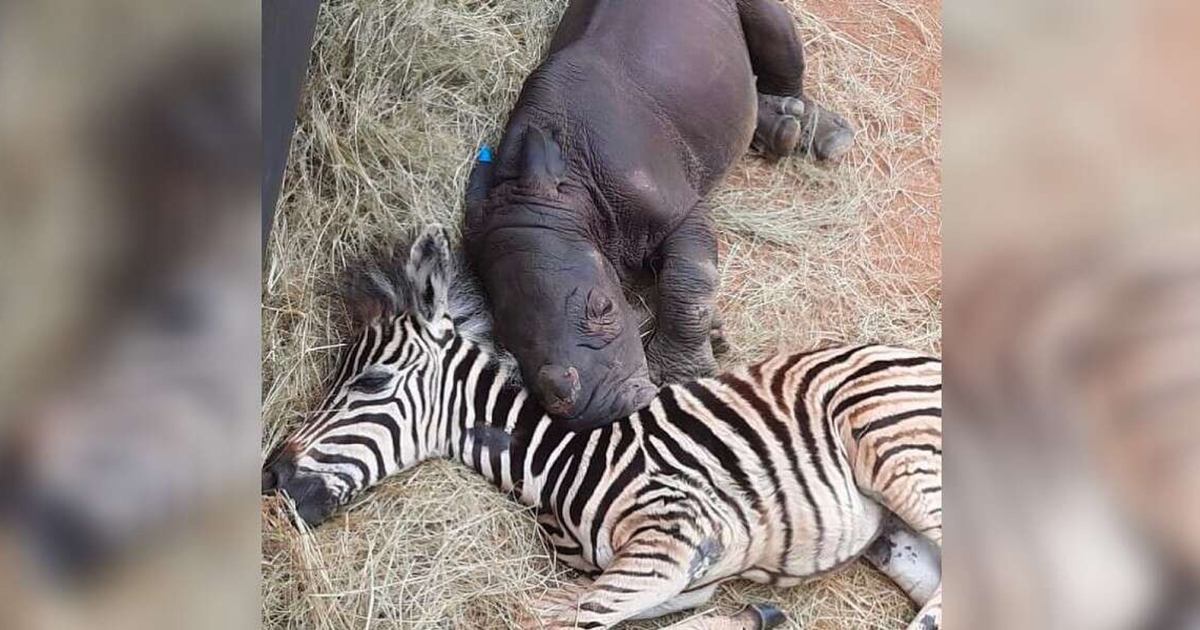 A baby rhinoceros and a young zebra make friends at the Wild Rhino Care Sanctuary. Both animals were rescued by rangers.